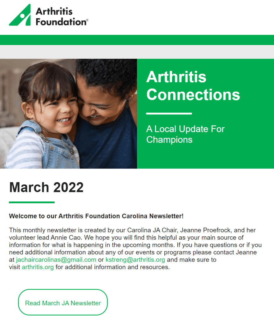 Collaborated with Juvenile Arthritis Leader to create quarterly newsletter for JA community.